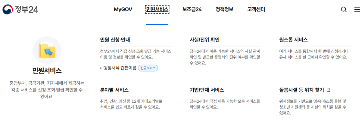 정부24(구 민원24)는 행정안전부가 운영하는 대한민국의 대표적인 온라인 행정서비스 포털입니다. 정부24시 홈페이지를 통해 5,000여 종의 민원 서비스를 언제 어디서나 쉽게 이용할 수 있습니다. 2017년 7월, 기존의 '민원24'에서 '정부24'로 명칭이 변경되면서 서비스의 범위와 기능이 대폭 확장되었습니다.